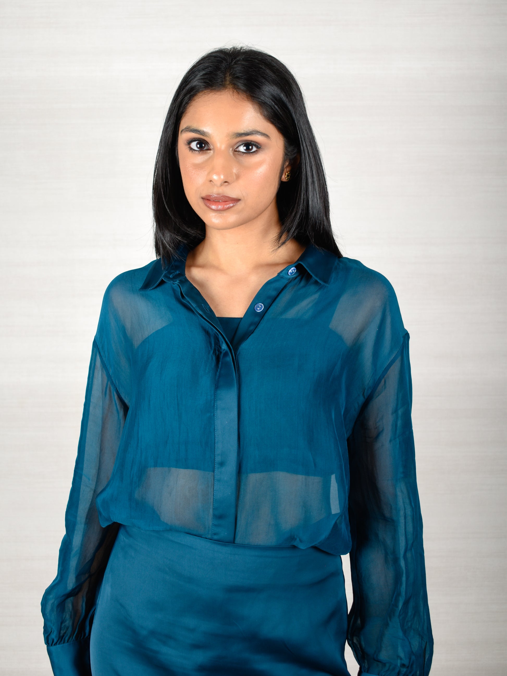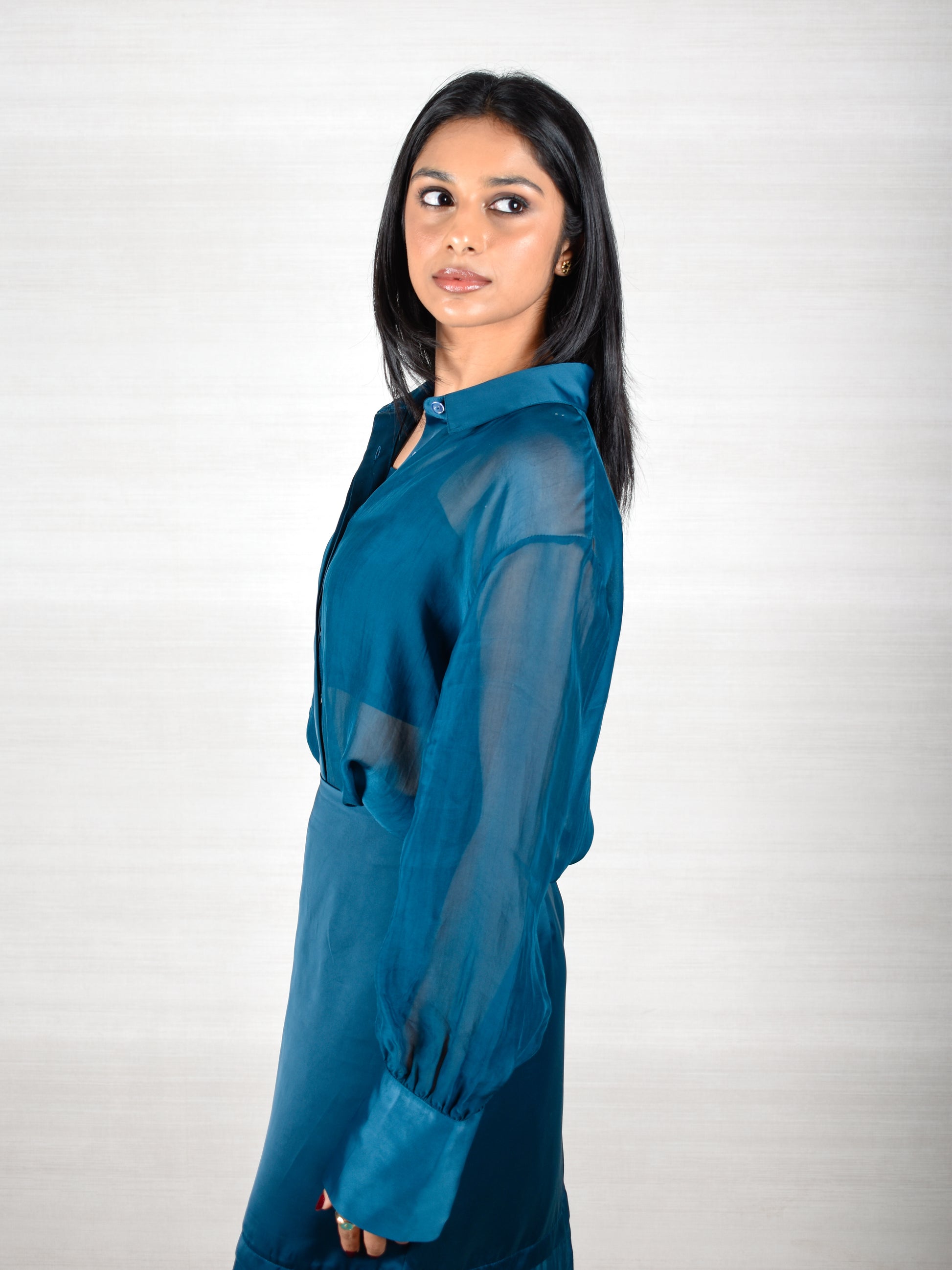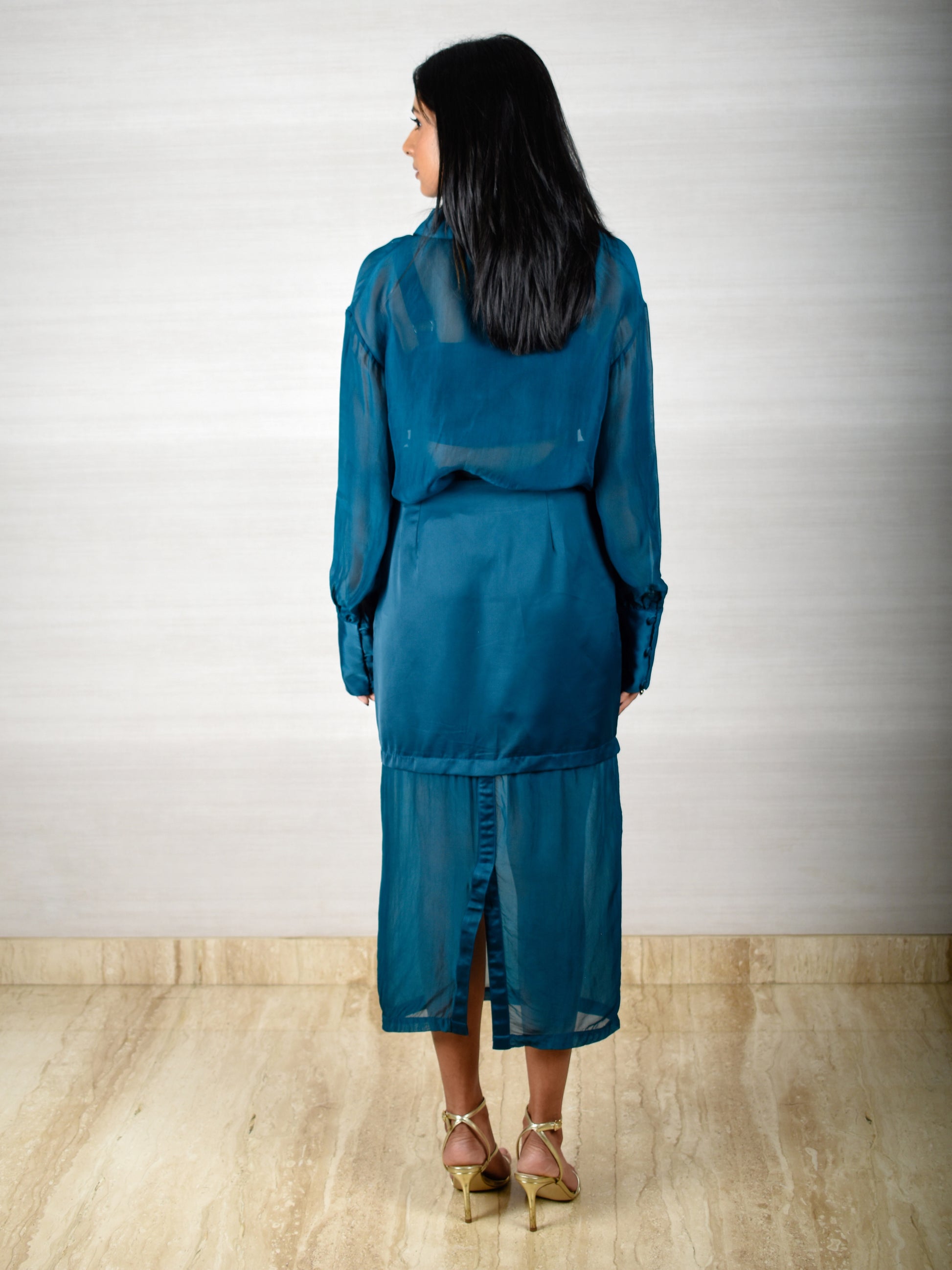 A shirt and skirt set elevated with a structured bustier. The fitted mini skirt sits under a sheer midi overlay, paired with sheer sleeves, sharp cuffs, and a clean collared shirt. Sleek, modern, and effortlessly statement-making — a true main-character silhouette.