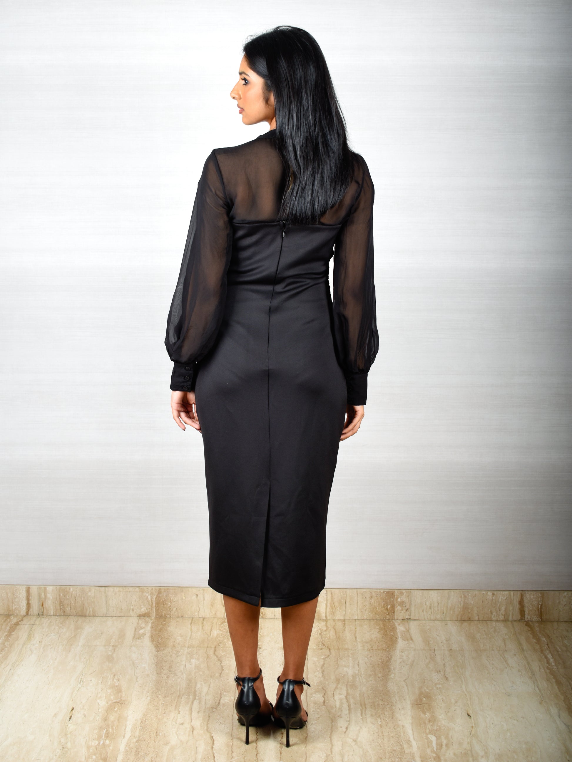 Elevate your evening look with this chic black midi dress Set. Designed with flattering stomach ruching and paired with a sheer organza bodysuit, this two-piece ensemble offers the perfect blend of structure, elegance, and modern allure.
