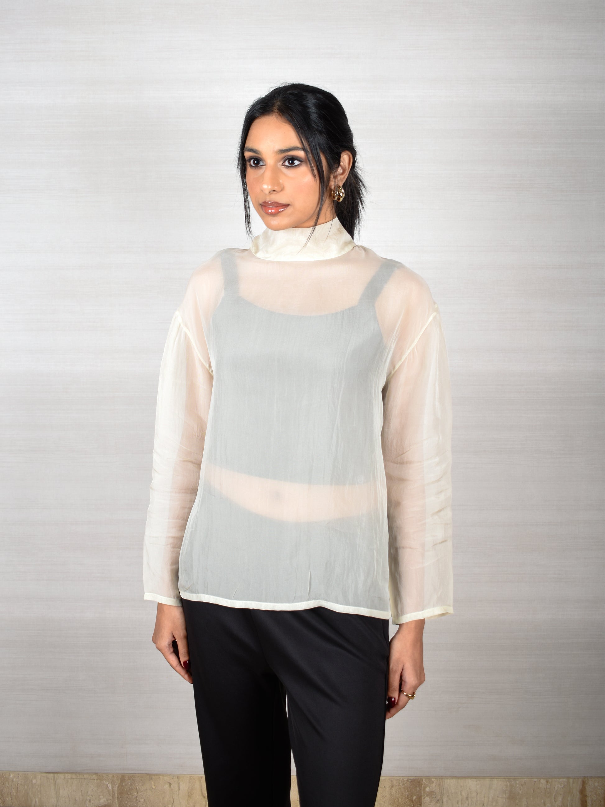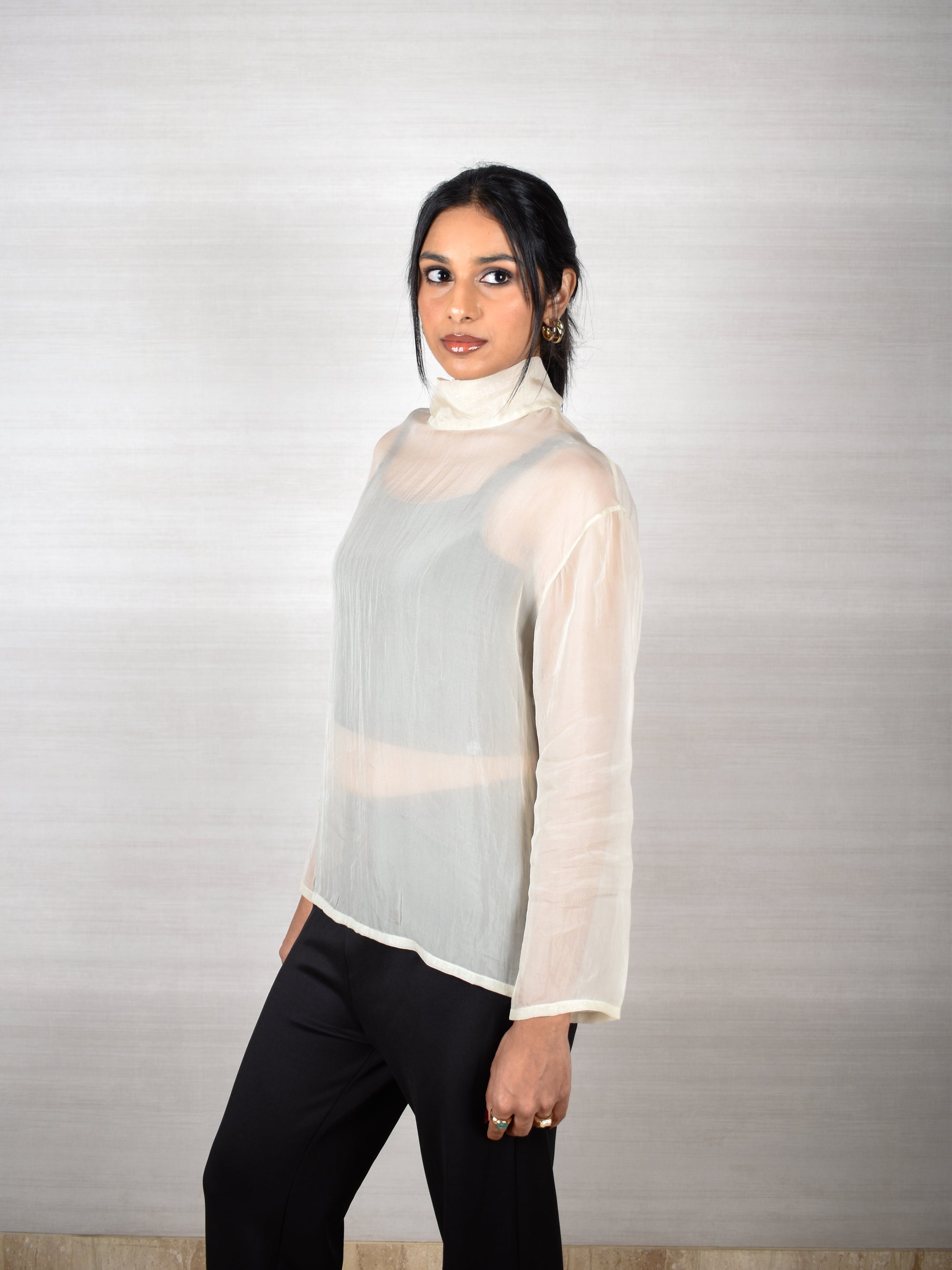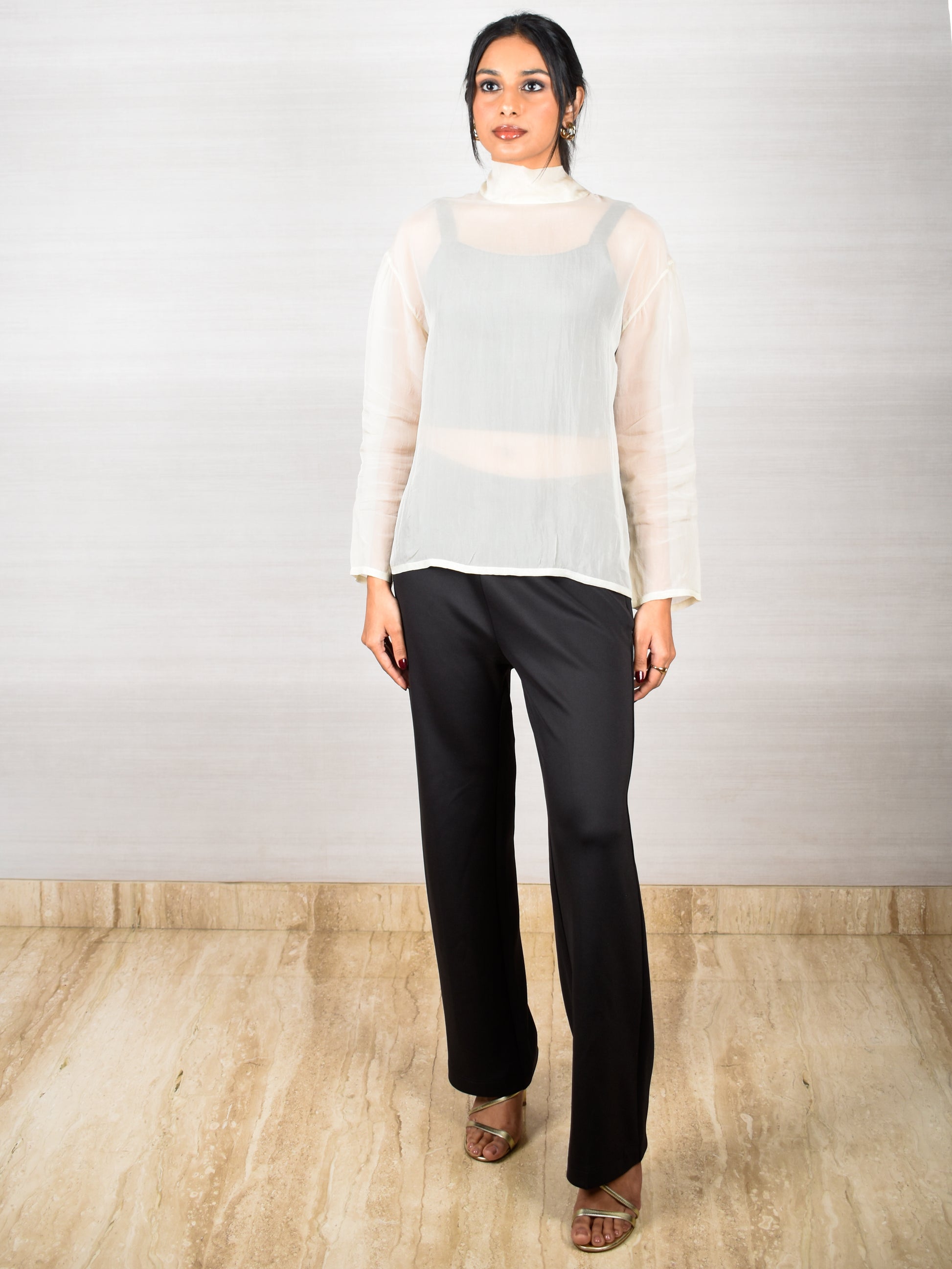 A sleek co-ord set with straight-fit pants and a sheer high-neck blouse. The delicate, see-through top adds softness and contrast to the clean, tailored pants, creating a modern and refined silhouette. An elevated take on everyday minimalism.